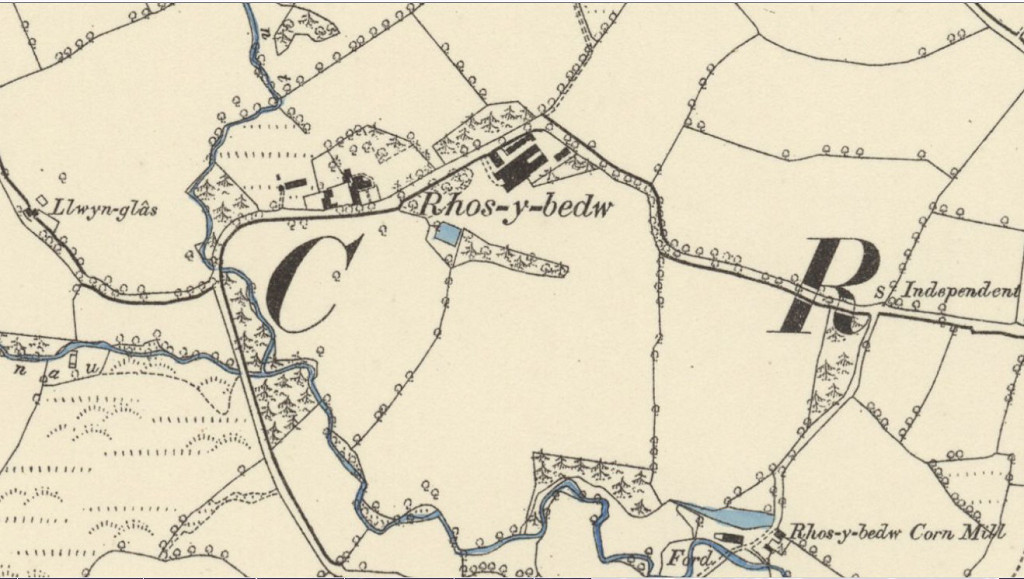 The brickworks at Ynys-Hafren was in use by 1809 when it was advertised for sale as at Cwmgelwr. On the 1840s Tithe Maps this appears to be the farm now known as Ffou-Fawr, the current Cwmgelwr farm being further East. The works is named 'Ynys-Hafren Brick Works on the 1878 OS map. By 1903 it had gone but a circular kiln is shown, being marked 'old kiln' in 1913.